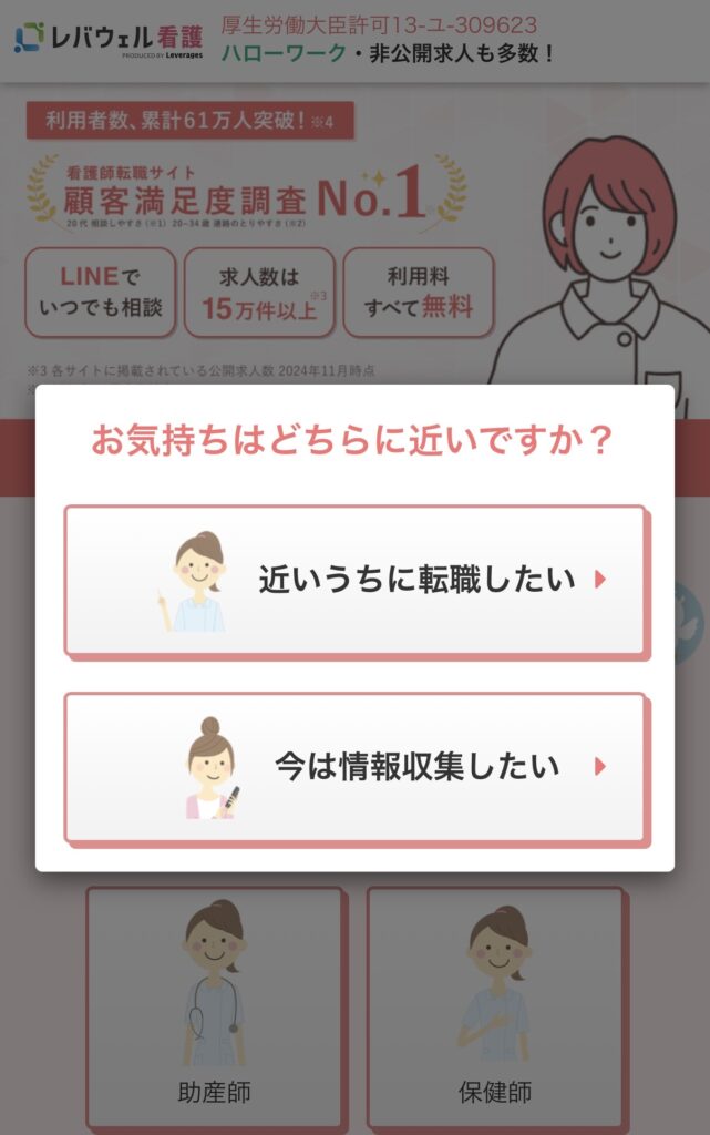 業界トップクラスの求人数、年間4,000回を超える職場訪問によって蓄積された内部情報が強みレバウェル看護を活用しながら、転職活動を進めるのがおすすめです。