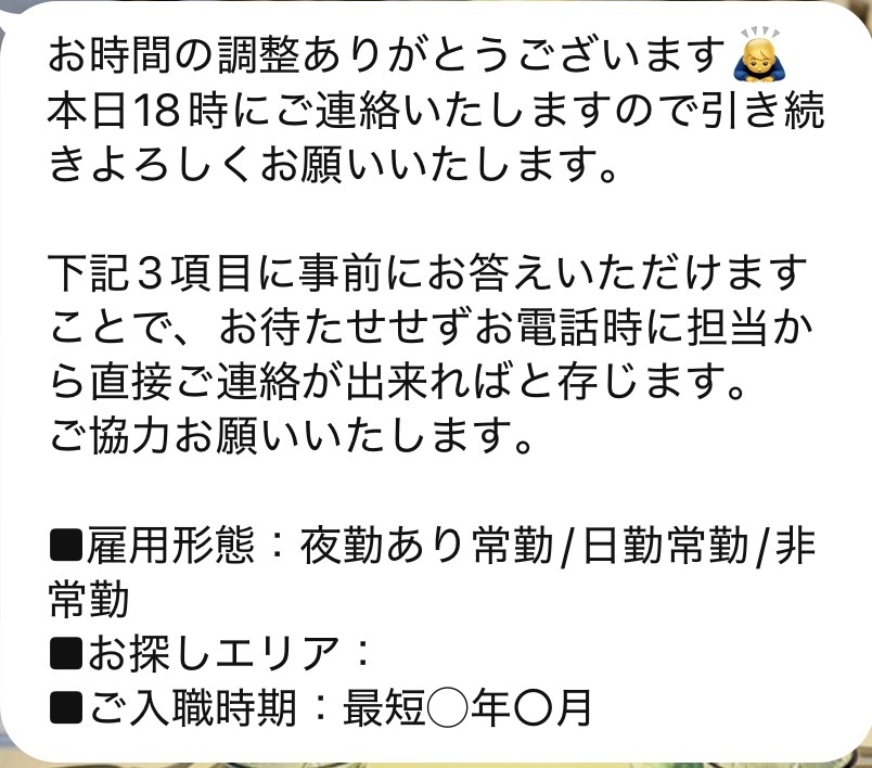 連絡方法をLINEのみにすれば、連絡のタイミングを自分でコントロールでき、夜勤明けに電話で起こされる心配もありません。やり取りの履歴が残るため、条件の確認漏れも起きにくくなります。